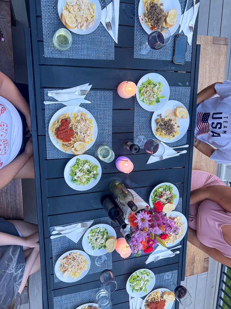 We kicked off the weekend with dinner at Rio 150, a mexican restaurant in Mooresville! My husband actually sent me this rec after coming across their viral tiktoks. Great drinks, solid mexican food, and very affordable! We did a grocery run before the trip so we could eat breakfast at the house and had snacks for our boat day. On Friday we created our own pasta bar for a DIY italian dinner- it was a big hit! I’ll definitely suggest this for future gatherings with large groups. Saturday we ate lunch at Optimist Hall, a food hall right outside of Uptown Charlotte. Again, it’s another great place to take a group of people because there are so many options to choose from! I ate the bao sliders from “Bao & Broth.” 10/10 would highly recommend! For dinner, we dined at Culinary Dropout in South End before heading out to dance. Our final meal was at Coquette in Uptown Charlotte. It was the perfect setting for a “girly” brunch with impeccable service!