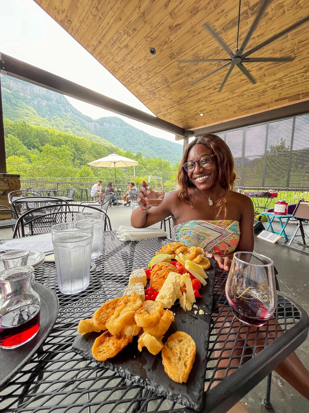 Charlotte has its fair share of breweries, so my husband and I decided to check out a cidery on Saturday afternoon. I’ve been a fan of Bold Rock Cider so it was fun to see the operation up close! As we drove home through Rutherford County, we made one more stop at Burntshirt Winery Tasting Room and Bistro in Chimney Rock, North Carolina. They have two locations. The winery and vineyard are in Hendersonville. The mountain views were gorgeous and you could even see a waterfall from the restaurant! They had a bluegrass band playing throughout the afternoon as we sipped our drinks. It was truly idyllic. Before this trip, I was unaware of just how many vineyards were in the Hendersonville area. So many that they call it the Crest of the Blue Ridge AVA or wine country. Now, it’s my mission to bring my mom and sister back for a weekend because they would love it!